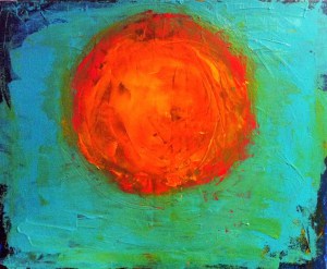 Cette toile représente pour moi le symbole de la renaissance. Je l’ai créée il y a quelques mois alors même que j’achevais une phase douloureuse de mon existence. Dans ce soleil en gestation, il y a une femme. Elle s’abandonne à cette boule de feu, en toute sérénité, car elle sait qu’un puissant processus alchimique est en cours. Toute crise intérieure n’est au fond qu’une gigantesque opération de nettoyage. Quand plus rien n’a de sens, quand tout s’effondre autour de nous, ce n’est pas une punition, bien au contraire c’est une initiation. Une opportunité de croissance et d’évolution.